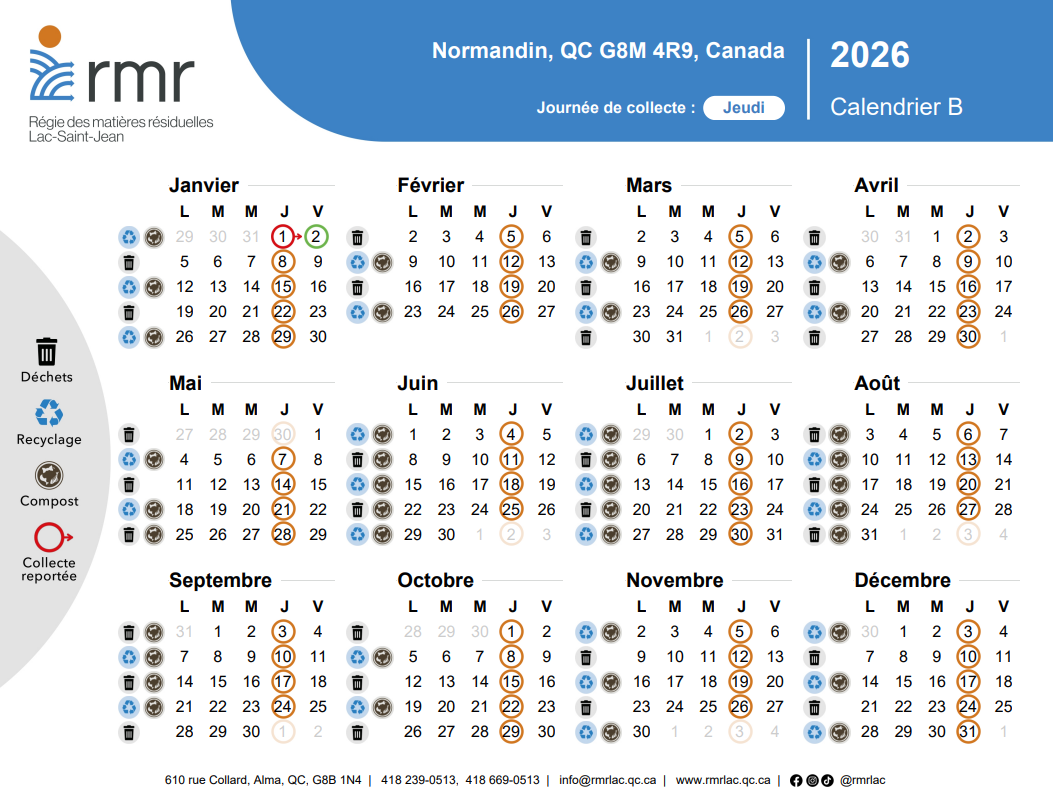Les bacs doivent être mis au chemin le mercredi soir, car la collecte a lieu le jeudi matin.